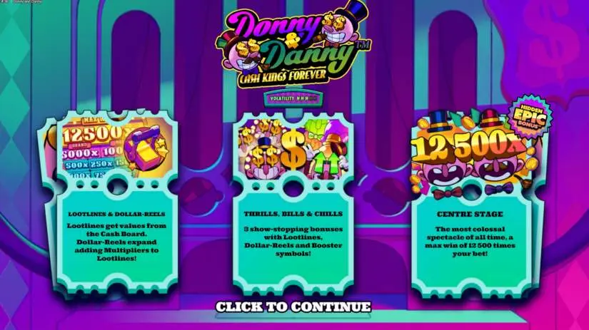 A LootLine is formed when a winning line contains at least three Donny symbols or a combination of at least three symbols consisting of Donny and Danny. In a winning LootLine, each Donny symbol selects a random value from the Cash Board located outside the grid. These values are added from left to right, top to bottom, and multiplied by the current bet to determine the win. Cash Board values are based on the following bet multipliers: 1x, 2x, 3x, 4x, 5x, 10x, 15x, 20x, 25x, 50x, 75x, 100x, 150x, 250x, 500x, 1000x, 5000x, 12,500x.