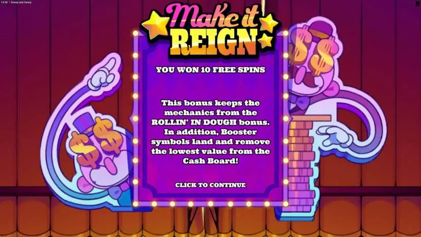 This bonus game retains the mechanics of the MAKE IT REIGN bonus. Additionally, it guarantees a full reel of Donny symbols on the final free spin! Landing additional FS symbols simultaneously during the bonus game awards additional free spins: