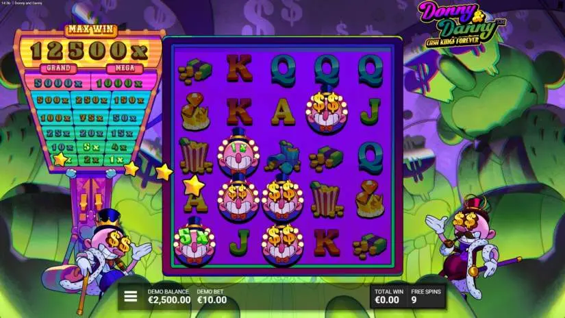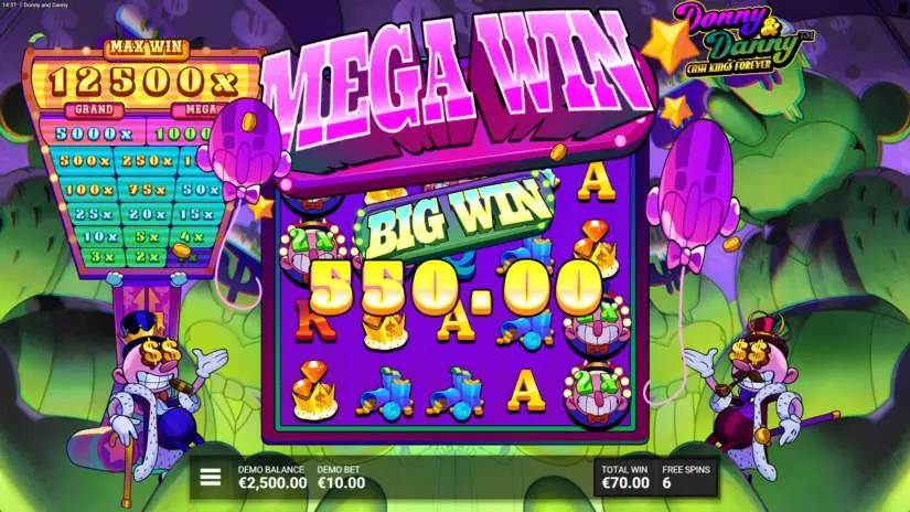 The maximum win in Donny and Danny is 12,500 times the current bet level. The maximum win can be achieved by activating certain combinations and/or features.