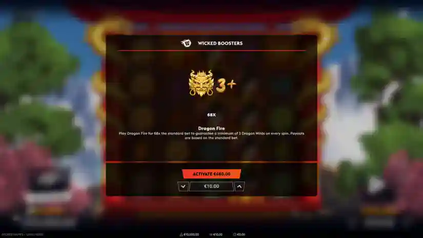 Play Dragon Fire with a bet of 68x your standard bet to guarantee at least 3 dragon Wild symbols on every spin. Payouts are calculated based on the standard bet.