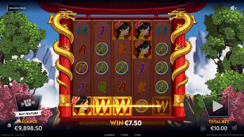 Dragon Trail by Wicked Games is a 5×5 slot with 20 paylines and substituting Wild symbols. Winning combinations begin on the leftmost reel, and symbols must appear consecutively along a payline. Only the highest win on each payline is paid. Wins and winning combinations are paid according to the paytable. Payouts for symbols displayed in the paytable correspond to the currently selected bet level. Matching wins are cumulative. Failures void all payouts and game results. All game rules are in English.