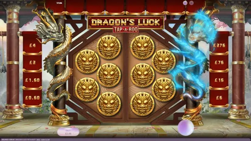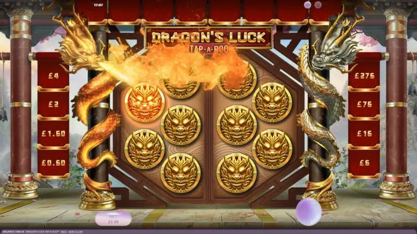 There are 10 Mystery Dragon Coin symbols in Red Tiger Gaming’s Dragon’s Luck Tap-A-Roo. Each bet boosts each of the two Dragons to a random level. When a Dragon is fully boosted, it breathes fire onto the Dragon Coins to activate them. When activated, the Dragon Coins spin, revealing a random CASH PRIZE equal to the bet MULTIPLIER. Possible prizes are: 0.3x, 0.8x, 1x, 2x, 3x, 8x, 38x, 138x. All Dragon Coins spinning in a single round reveal the same CASH PRIZE.