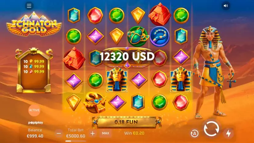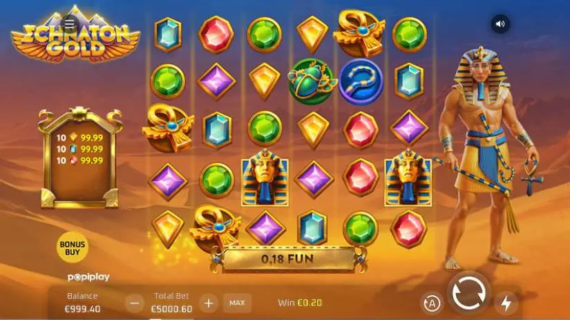 Echnaton Gold from PopiPlay is a highly volatile 6×5 slot game that offers players the chance to win big, with a staggering maximum win of 10,200 times the bet. The thrilling reels with the Refilling feature ensure the excitement never lets up as symbols cascade into place, creating endless winning combinations.