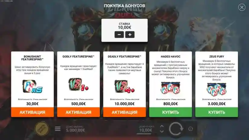 If the player purchases GODLY FEATURESPINS™, the theoretical return to player (RTP) is 96.34%. For full details on this feature, see the section above. FS symbols cannot appear in this game mode. Each spin guarantees at least 1 DuelReel! Volatility: Very High.