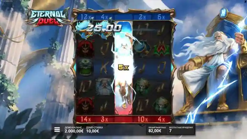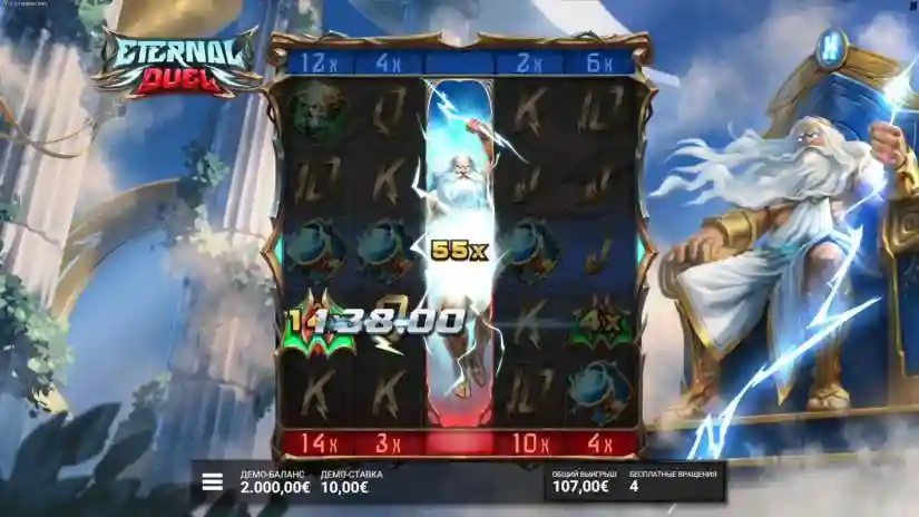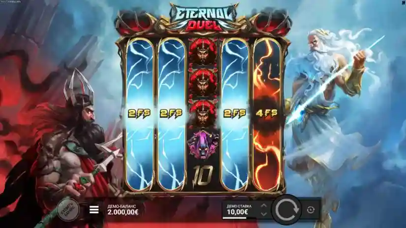 Each FS DuelReel awards a minimum of +2 and a maximum of +10 free spins. Landing one or more FS DuelReels™ with 1 Upgrade triggers the ZEUS FURY bonus round. Landing FS DuelReels™ with 2 Upgrades triggers the ETERNAL DESTRUCTION bonus round.