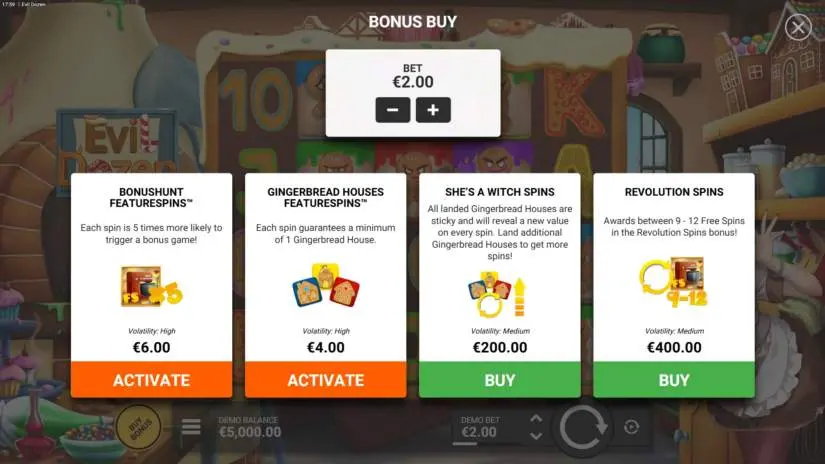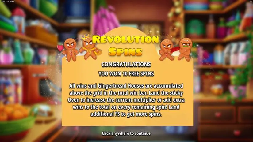 Gingerbread houses unlock Wild multipliers. There are three types of Gingerbread Houses: Low, Medium, and High. All winning combinations involving the Gingerbread House are multiplied by the value shown. If there are multiple Gingerbread Houses in the same payline, their multipliers are first added up and then applied to the win. If 3 Gingerbread Houses of any type appear anywhere on the same spin in the main game, the She’s a Witch Spins bonus game is activated! The positions and type of activated Gingerbread houses carry over to the bonus.