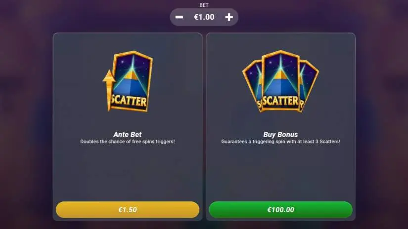 Buy a bonus for 100x the standard bet to get a guaranteed spin with at least 3 Scatter symbols. Clicking the Buy Bonus button will open a menu with all available features to buy. The total cost of buying a feature is displayed and calculated as a multiple of the standard bet. The standard bet can be increased or decreased to change the cost of buying a feature.
