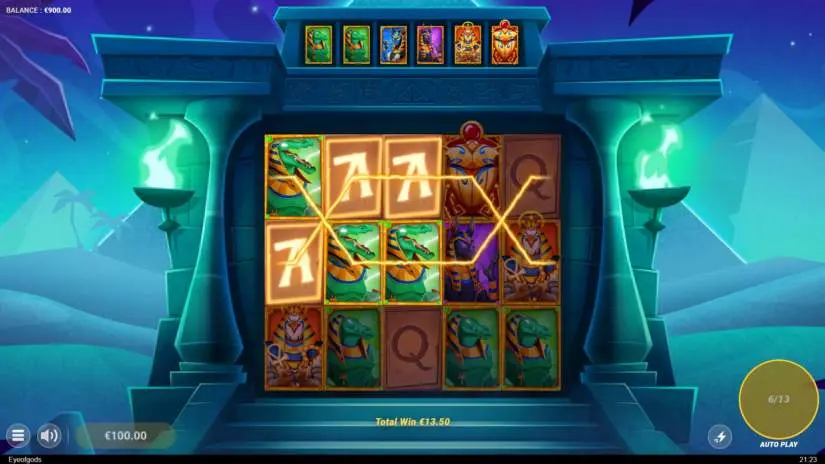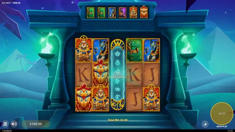 The maximum win in the Eye of Gods slot is capped at 3,500 times your stake. Reaching this limit will immediately stop the bonus feature and your winnings will be credited. If the limit is reached during free spins and/or other bonus features, the feature will end and any remaining free spins and/or bonus features will be cancelled.