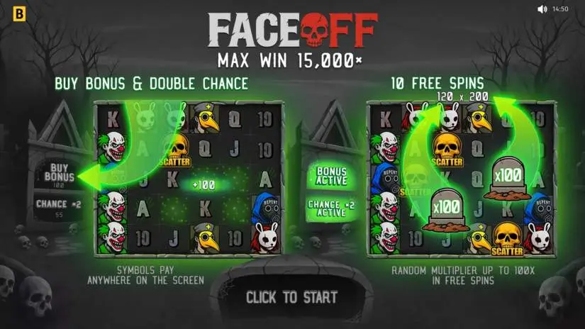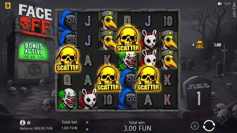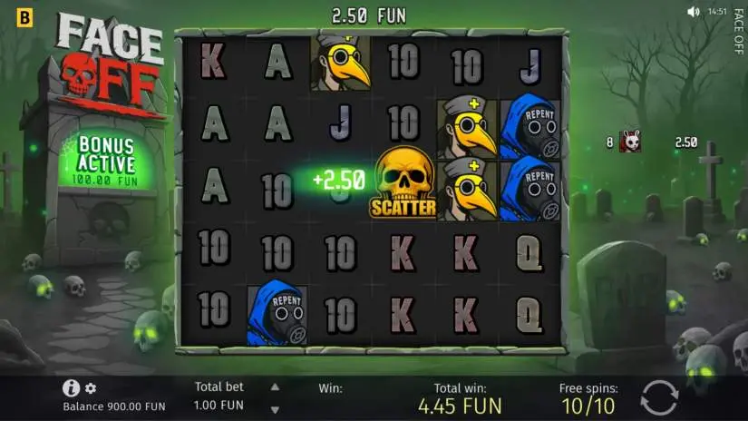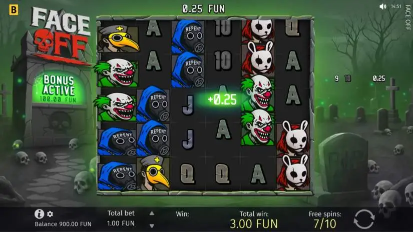 In the Face Off slot from BGaming, you find yourself in a cursed cemetery. How did you get here? Did you stumble upon this godforsaken place by chance, or… were you brought back from the dead by some mysterious force? You’ll never know for sure. But you can be confident in your great chances of winning big. Brace yourself and spin the reels! Thanks to the refill feature, winning combinations disappear, allowing new symbols to appear and potentially create even more winning combinations. Watch out for the skulls! These scatter symbols not only award winnings but also trigger free spins. During free spins, you’ll also encounter tombstones that bring not only sorrow but also joy, as each one has a multiplier of up to x100!