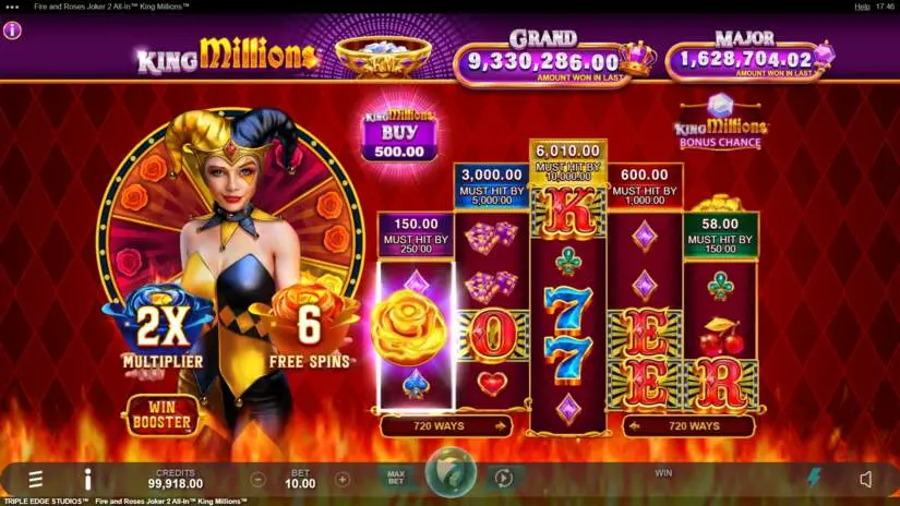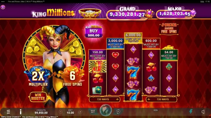 Fire and Roses Joker 2 All-In King Millions features 720 combinations in the main game. During Free Spins, the number of combinations increases to 1125, 1280, 2000, or 3125. A combination is a series of adjacent symbols lining up on the reels. A player wins when identical symbols appear in adjacent positions within a combination. Combination wins are multiplied by the bet multiplier. Combination wins are counted from left to right and from right to left, starting from the first and last reels, respectively.