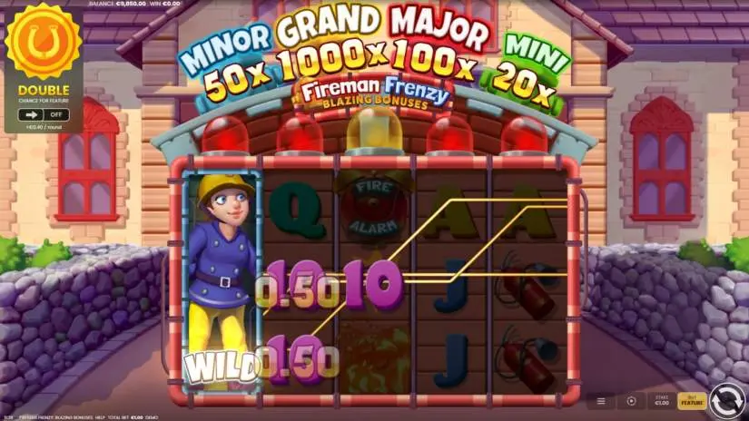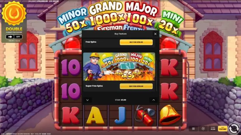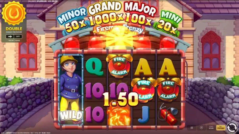Enabling Double Chance in Fireman Frenzy: Blazing Bonuses doubles your chances of winning in the game, increasing your total bet on each spin. The amount of the total bet increase is always displayed in the Double Chance window.