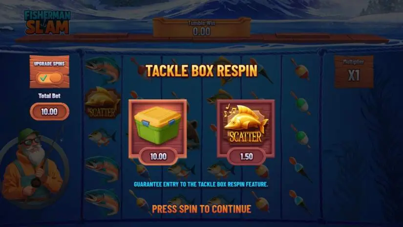 Win up to 5000x your bet in Fisherman Slam! If the total of all values reaches 5000x or higher, the bonus game ends, and the player receives a win of 5000x your bet.