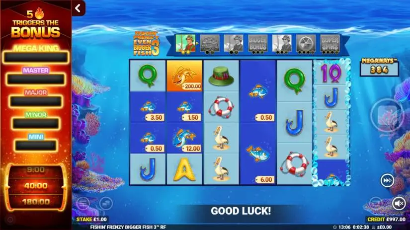 Each reel in Fishin’ Frenzy Even Bigger Fish 3 can contain up to 5 symbols. Up to 15,625 winning combinations are possible with each spin! A winning combination is a combination of consecutive symbols, regardless of their height, from left to right, starting with the leftmost reel. Only the highest win in each combination is paid. All winning combinations are cumulative. Megaways™ is licensed by Big Time Gaming.