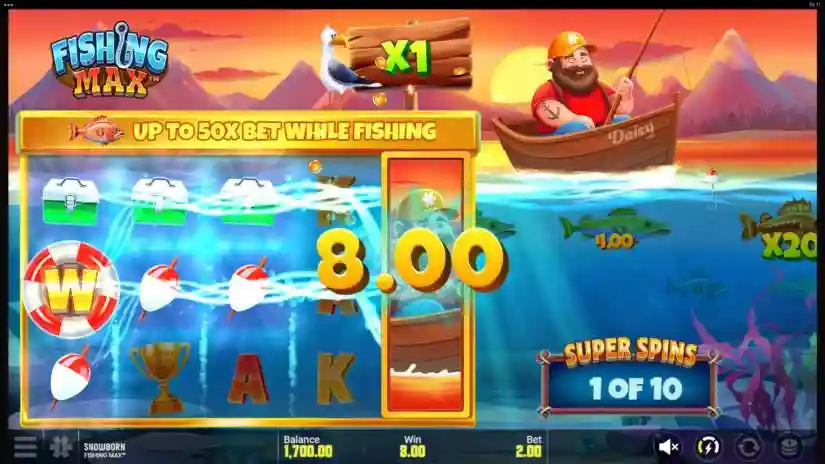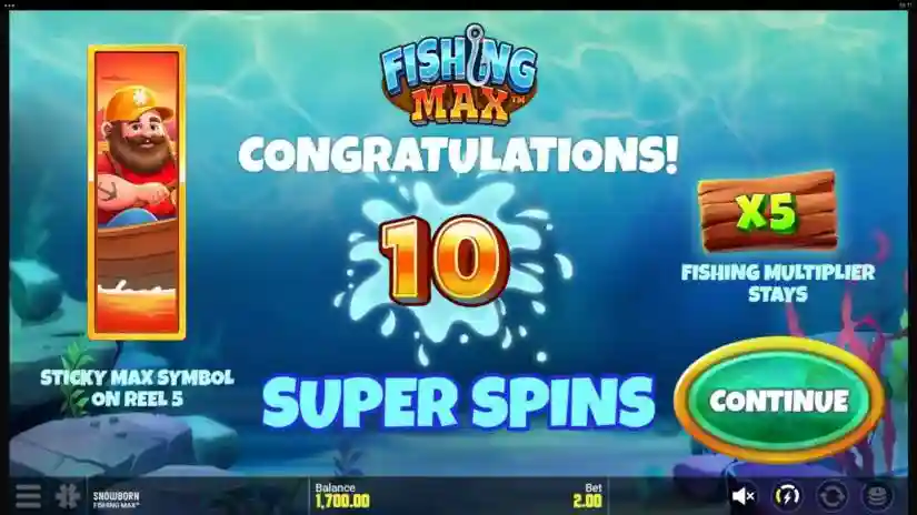 The goal of Fishing Max by Snowborn Games is to spin the reels until a winning combination appears. Winning combinations are highlighted on the reels and pay out. This is a 5-reel, 3-row slot machine. Spins during the Free Spins feature are called Free Spins. Spins during the Super Free Spins feature are called Super Spins. This game can only be played with credits.