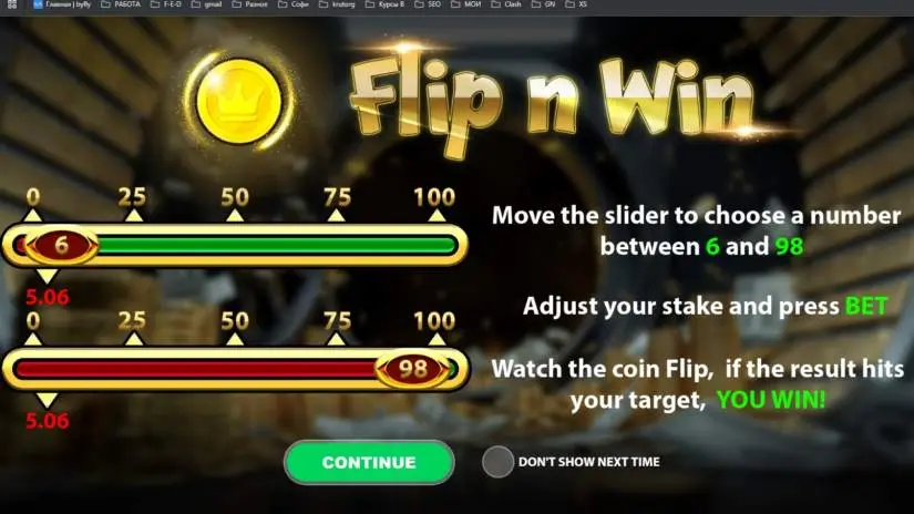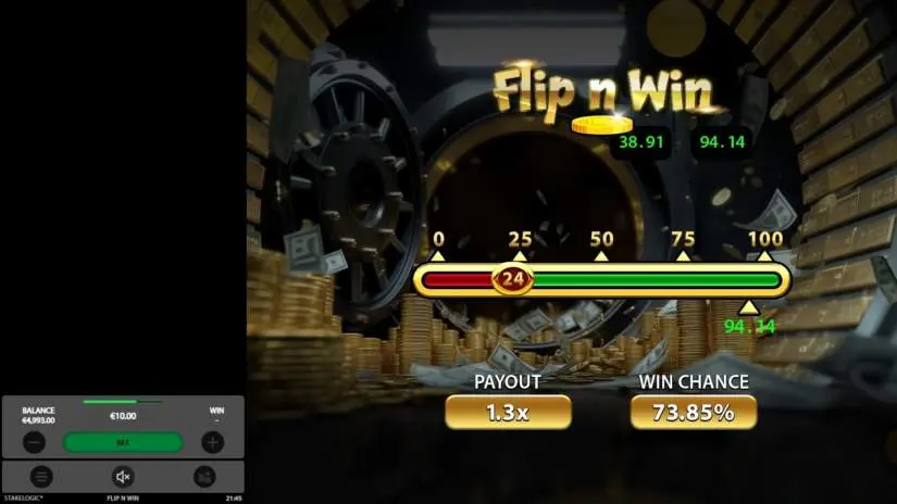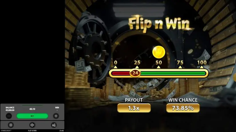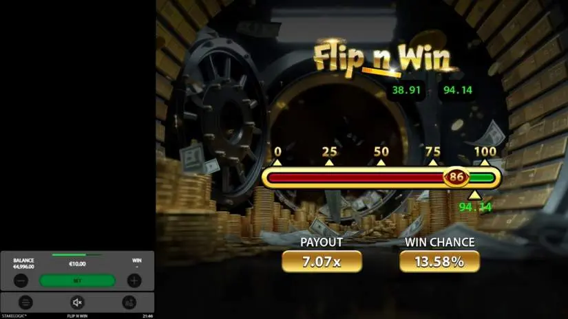 Flip n Win is an instant-win game from Stakelogic where players flip a virtual coin to land on a winning number within a predetermined range. Players adjust the probability slider to set their desired chance of winning from 6% to 98%.