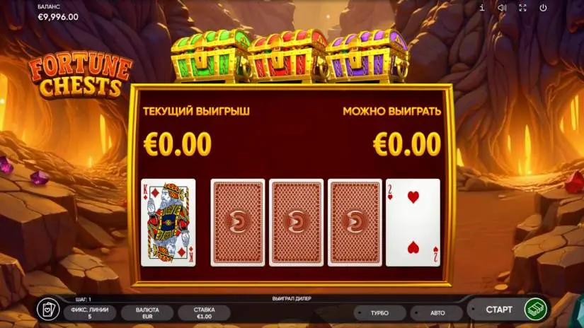 Don’t miss your chance to multiply your winnings in Fortune Chests! Choose one of four face-down cards. If you beat the dealer’s card, your winnings are doubled, and you can bet it again (maximum 10 attempts). If the dealer wins, you lose all your winnings, and the Risk Game ends.