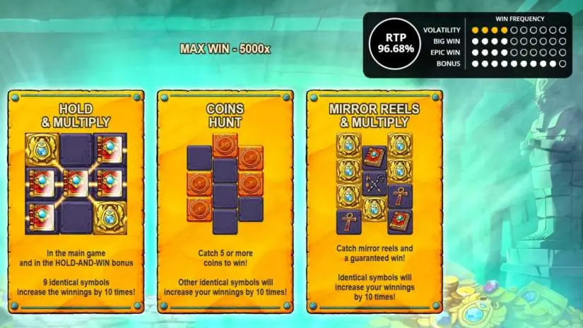 3-reel slot with a reel height of 3-4-3, with coins and the Coin Hunt bonus, plays on 10 lines. In the main game, all symbols except coins bring wins on lines. If all lines are played, and all symbols are the same or WILD, then the win on lines is multiplied by 10. In the main game and in the bonus, coins with a denomination from 0.5 to 1000 can fall on the reels anywhere. Each time 5 or more coins fall, a win equal to the sum of the coin denominations multiplied by the bet is awarded. The Coin Hunt bonus is awarded randomly and plays at the same bet as the main game. The bonus has 8 free spins and only coins fall on the reels. Each time 5 or more coins fall, a win equal to the sum of the coin denominations multiplied by the bet is awarded.