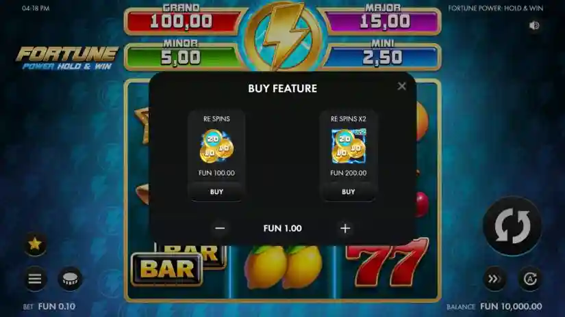 The maximum winning amount in Fortune Power Hold & Win is capped at 2000x the bet. At the current bet, the maximum win is FUN 200.00.