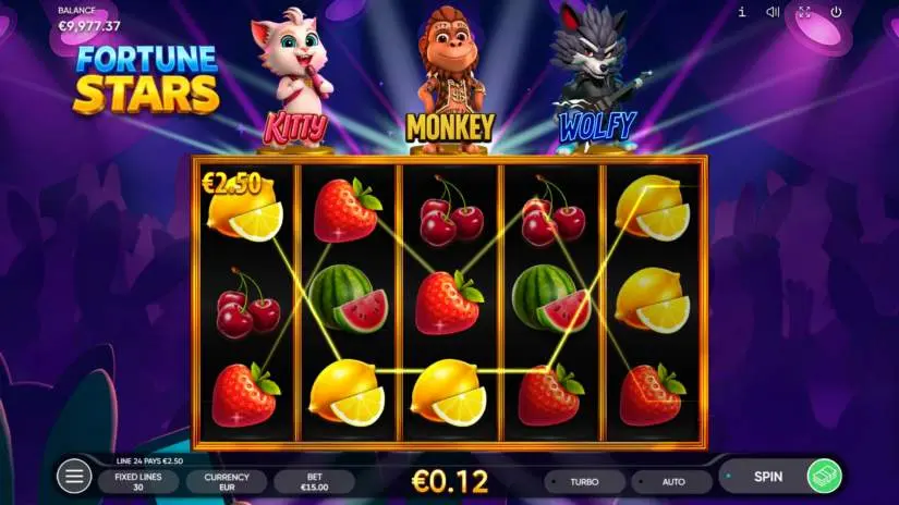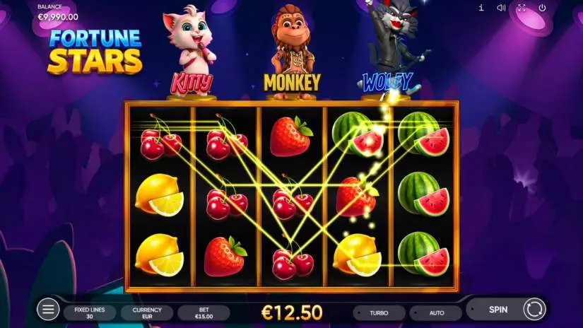 FORTUNE STARS is a 5-reel, 3-row slot from Endorphina with 30 fixed paylines. All prizes are awarded for combinations of identical symbols. Symbols must appear on paylines and on adjacent reels, starting with the leftmost one. Only the highest win is paid for combinations on each line. Wins for combinations on different lines are added together.