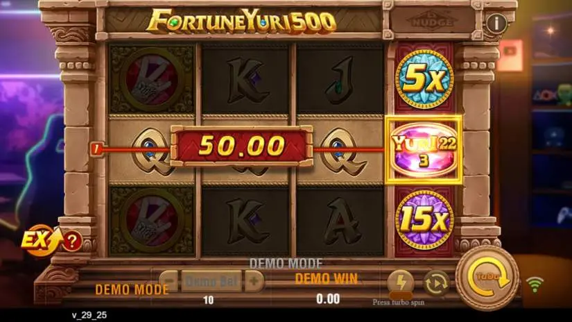 The fourth reel is a special reel where multiplier symbols and Ex NUDGE symbols appear randomly. All winning payouts are multiplied by the multiplier in the center of the reel or when the Ex NUDGE symbol appears. There are 11 multipliers in total: 1x, 2x, 3x, 5x, 10x, 15x, 20x, 25x, 50x, and 100x, with a maximum of 500x.