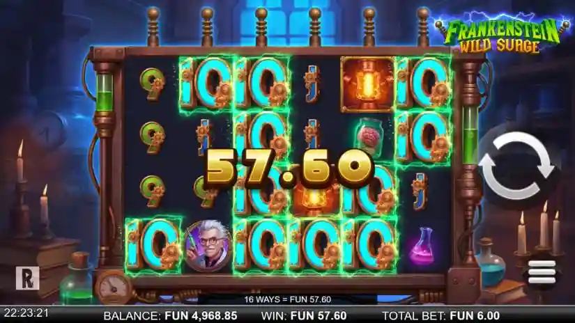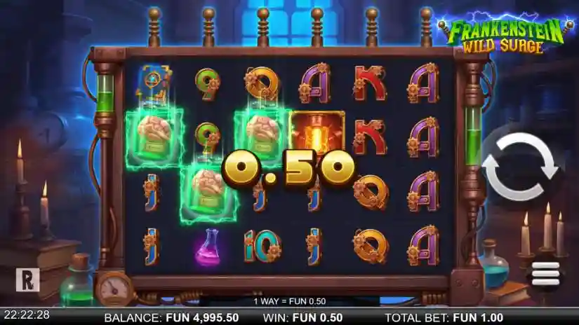 The player chooses the total bet amount for ReelPlay’s Frankenstein Wild Surge game in 4096 ways. The base bet is equal to the total bet divided by 20. Payouts are determined according to the paytable. All wins are multiplied by the total bet. FRANKENSTEIN PRIZES are already multiplied by the total bet. The maximum win is paid for a winning combination. Matching wins are summed. Only positions containing the winning symbol are used to determine the win for this symbol. All wins begin on the leftmost reel and are paid only from left to right on adjacent reels. The Frankenstein Wild substitutes for all symbols except the Scatter. The Frankenstein Wild and Scatter appear on reels 2, 3, 4, and 5 only during the base cycle (on all reels during free spins). The Frankenstein Wild does not pay out as a standalone symbol. A crash voids all payouts and game results.