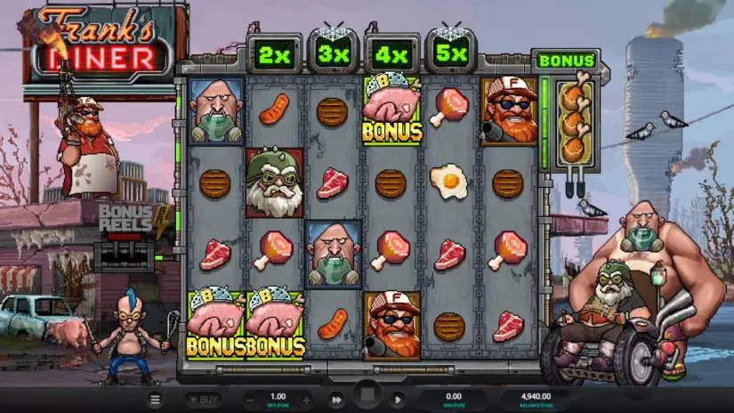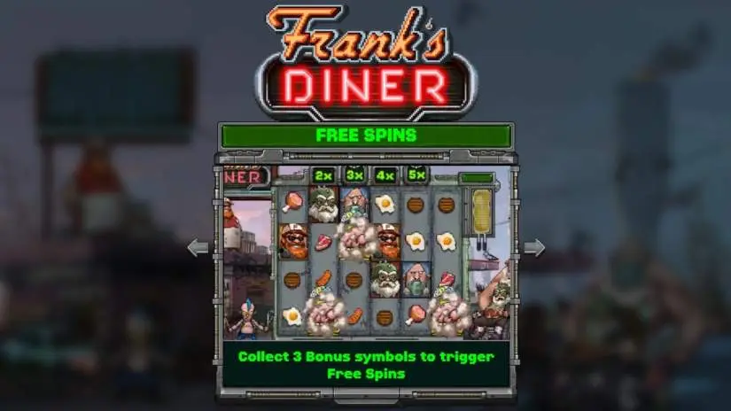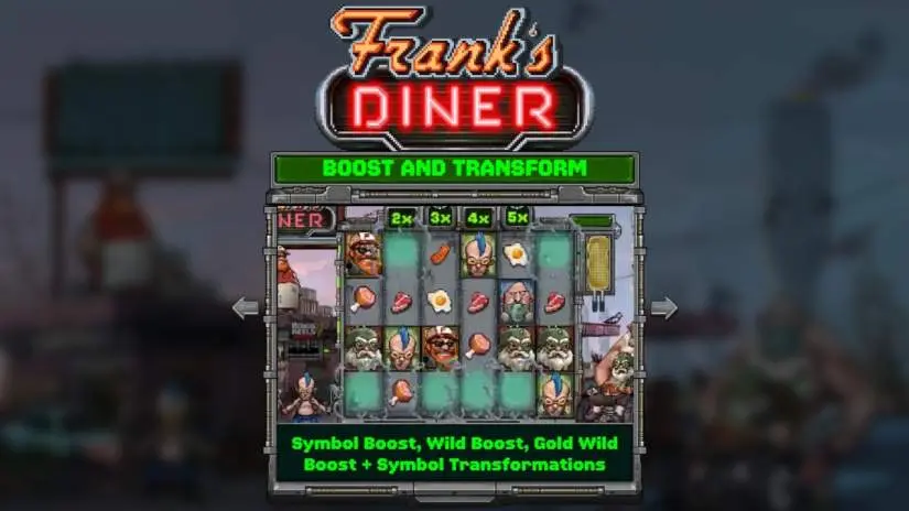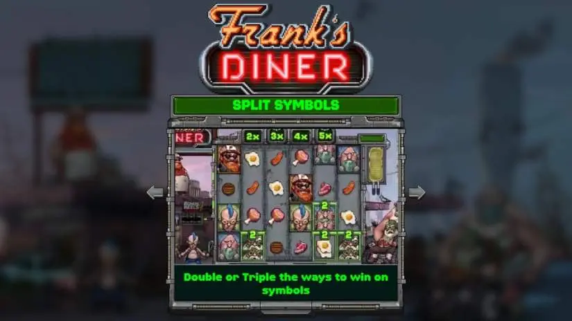 If the sum of all values in Frank’s Diner reaches 10,000x or higher, the round ends and the player is awarded 10,000x the bet.