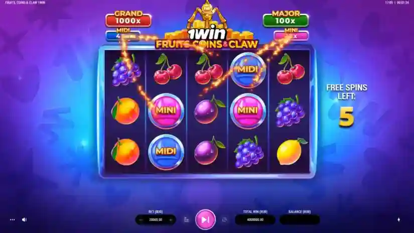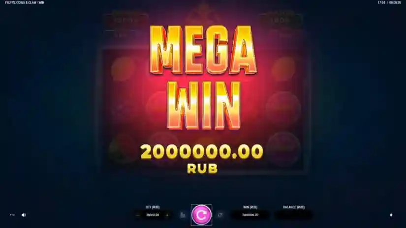 The maximum win in Fruits, Coins & Claw by Clawbuster is capped at 2,000 times the bet. If the total win in a round reaches 2,000 times the bet, the round ends immediately, the winnings are awarded up to the set limit, and all remaining features are cancelled.
