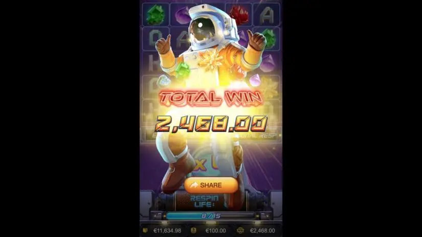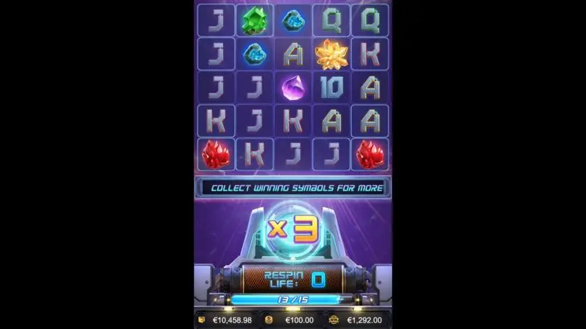 Galactic Gems is a 5-reel video slot from PG Soft with 5 rows of symbols, re-spins, and bonus re-spins with a multiplier. When all blockers are destroyed, the bonus re-spins feature is activated, granting 1 extra life and a 1x multiplier. Collecting 15 winning symbols will increase the number of extra lives by 1!