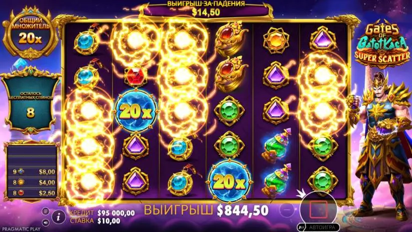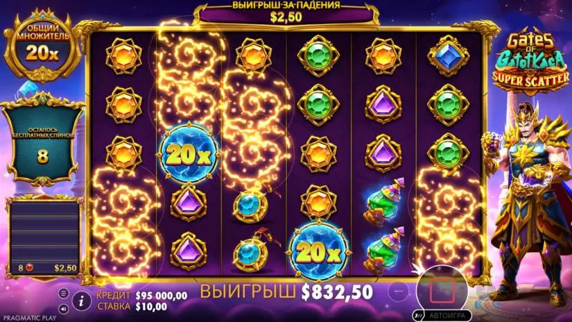 Possible values: 2x, 3x, 4x, 5x, 6x, 8x, 10x, 12x, 15x, 20x, 25x, 50x, 100x, 250x, or 500x the total bet. After a series of falls, the values of all MULTIPLIER symbols on the screen are summed up, and the total win for the series is multiplied by the final value.