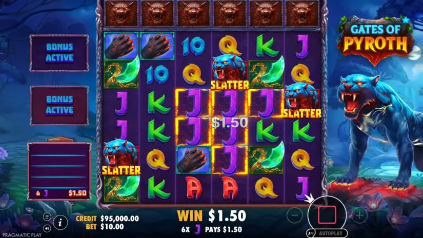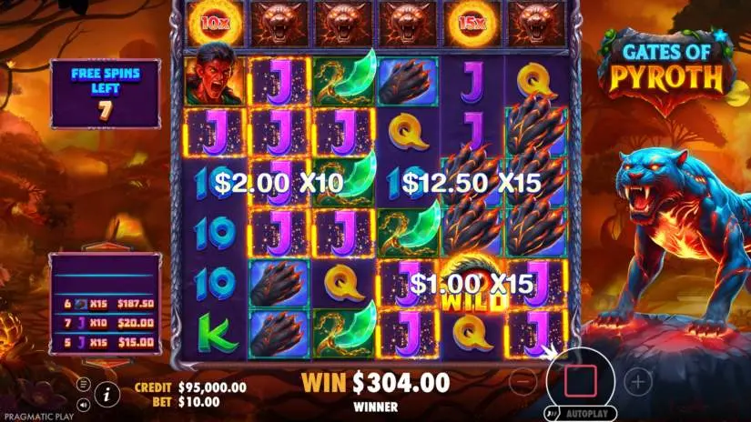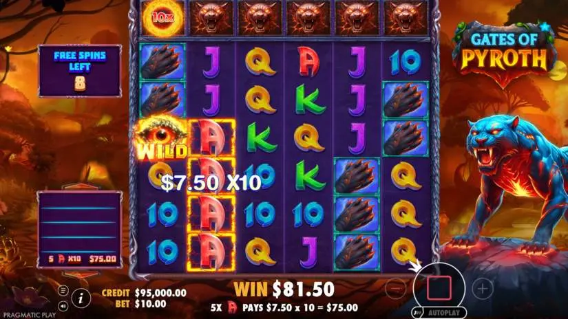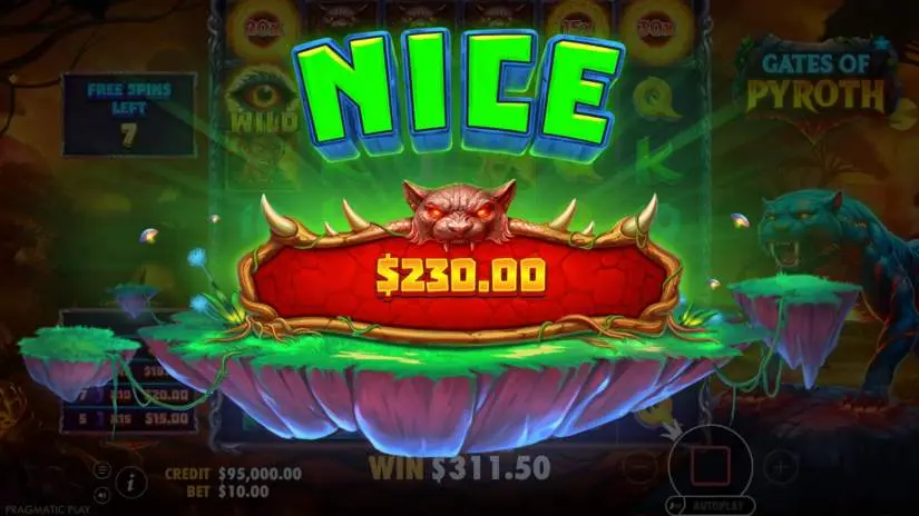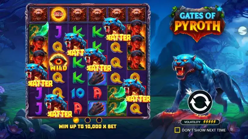 The maximum win in Gates of Pyroth is capped at 10,000x the bet in both the main game and free spins. If the total win during the FREE SPINS round reaches 10,000x the bet, the round ends immediately, the winnings are awarded, and all remaining free spins are cancelled.
