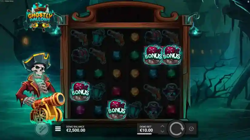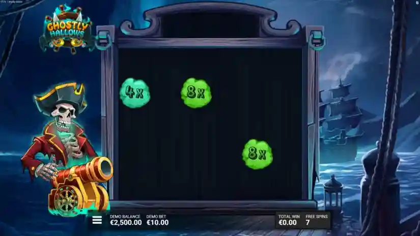 Activate the Ghostly Pirate’s Trail bonus with 10 free spins by landing four Bonus Scatter symbols simultaneously in the base game.