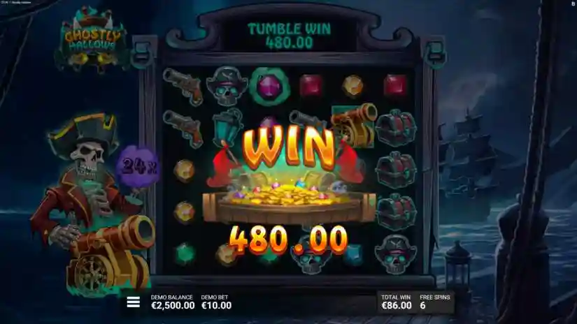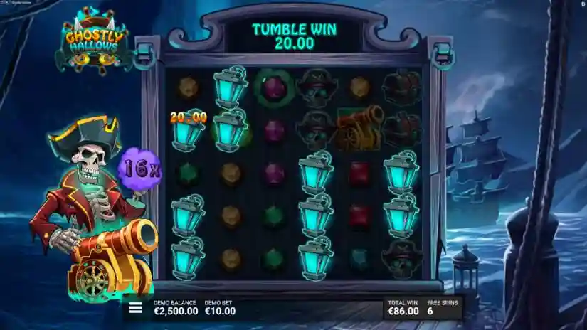 Journey to the afterlife in Ghostly Hallows from Backseat Gaming and Hacksaw Gaming! This cascading, 6-reel, 5-row game with all-scatter wins terrifies the high seas with ominous, ghostly clouds of multipliers left behind by symbols. When wins land on them, their power is collected into a Cannon, and once the Cannon symbol is triggered, it fires, scattering the accumulated multiplier across the cascading win for a chilling payout!
