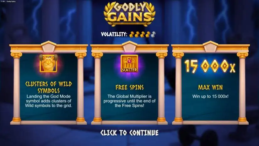 The maximum win in Godly Gains is 15,000 times the current bet level. The maximum win can be achieved by activating certain combinations and/or features.