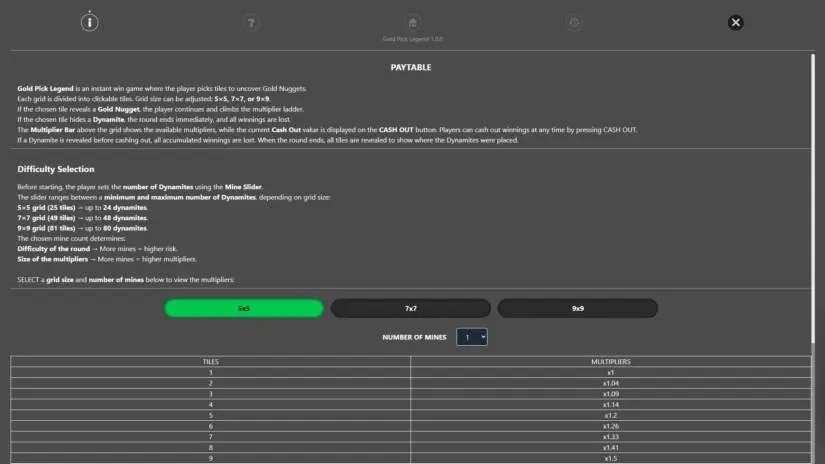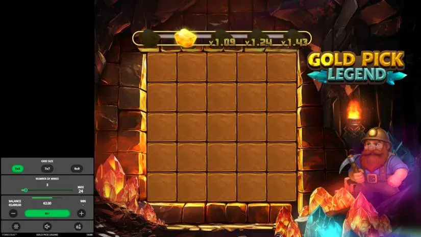 Gold Pick Legend is an instant-win game from Stakelogic where players select tiles to reveal gold nuggets. Each grid is divided into clickable tiles. The grid size can be adjusted to 5×5, 7×7, or 9×9. If a selected tile reveals a gold nugget, the player continues the game and climbs the multiplier ladder. If a selected tile reveals dynamite, the round ends immediately and all winnings are lost. A multiplier bar above the grid displays available multipliers, and the current Cash Out value is displayed on the Cash Out button. Players can cash out winnings at any time by clicking Cash Out. If a dynamite is revealed before cashing out, all accumulated winnings are lost. At the end of the round, all tiles are revealed to reveal where the dynamites were planted.