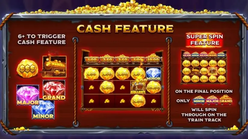Locating 6 or more Cash Prize symbols or 5 Cash Prize symbols along with one Train symbol on a reel in the main game triggers the Cash Prize Win feature. The Cash Prize symbols and Train symbol that triggered the feature remain in place for the entire duration. During the Cash Prize feature, only Train symbols, Scatter symbols, or blank symbols can appear on the reels. The player has 3 spins to trigger a new symbol on the reel. Each time a Scatter or Train symbol appears on the reel, it is locked in place, and the spin counter resets to 3. If a Scatter symbol appears on a reel, it transforms into a Cash Prize symbol of the same value as the prize in the train car directly above that reel. The Cash Prize feature continues until all spins are used or all reel positions are filled with non-blank symbols, at which point the player is paid the total amount of all Cash Prize symbols displayed on the reel.