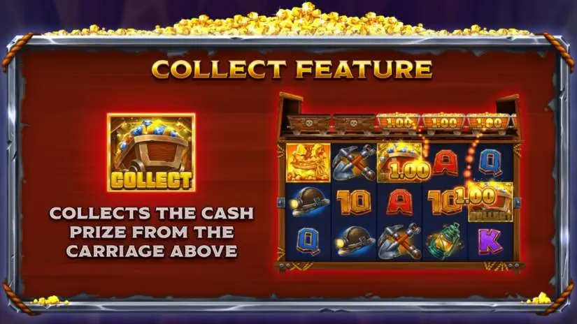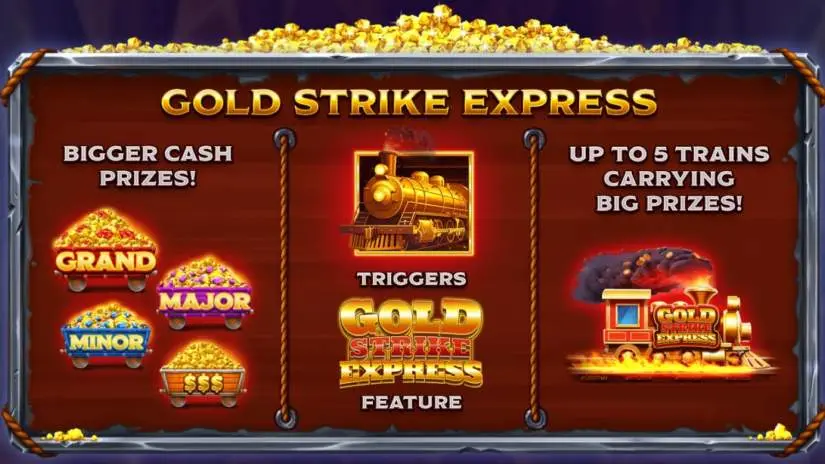 A train symbol appearing anywhere on the screen during the cash round triggers the Golden Strike Express feature. The Golden Strike Express feature is only activated after the cash rounds and super spins have been completed and the total winnings have been calculated. Then, the Golden Strike Express trains begin moving along the tracks. Each Golden Strike Express train has a random number of cars with prizes. Up to five Golden Strike Express trains may appear on the tracks before the feature ends and the total value of all prizes is calculated.