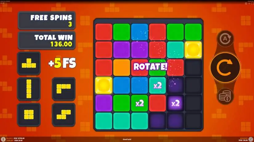 After all winning clusters disappear from the field, the symbols drop to the bottom, and new winning clusters stop forming, the field automatically rotates 90 degrees clockwise. This causes all symbols on the field to drop to the bottom, triggering a cascade, which completely fills the field with new symbols. The cells and multipliers rotate along with the symbols. The field rotation continues as long as the conditions for winning clusters and empty positions are met. During the bonus game, a new row of cells and symbols is added to the top of the field with each spin. The maximum field size in the bonus game is 10 columns and 10 rows.