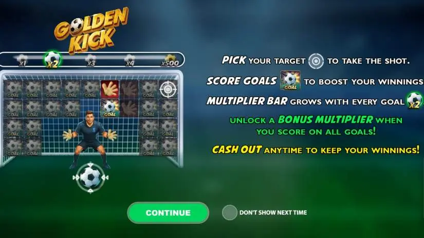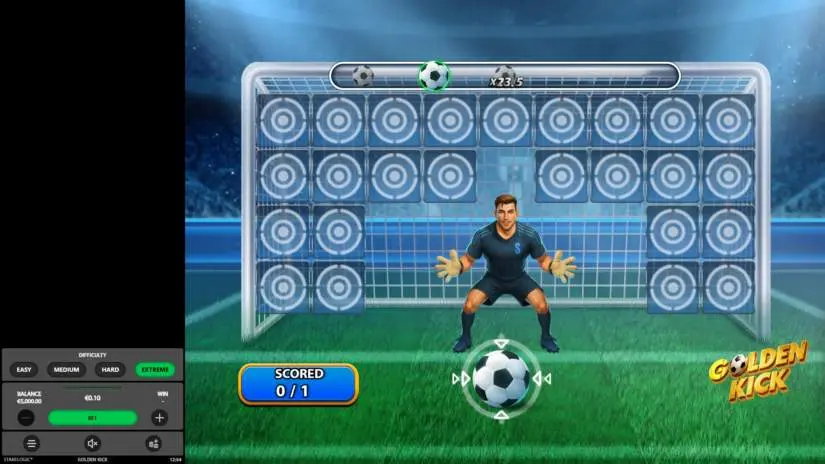 Golden Kick is an instant-win game from Stakelogic in which the player scores penalties against a goalkeeper. Each penalty kick is divided into 25 zones available for tapping. The player selects one zone for each attempt.