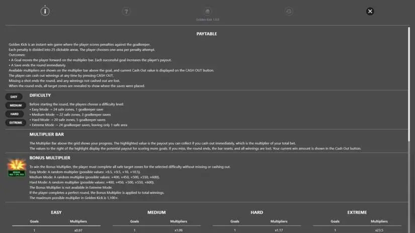 The bonus multiplier is not available in Extreme Mode. If the player completes the round perfectly, the bonus multiplier is applied to the total winnings. The maximum possible multiplier in Golden Kick is 1100x.