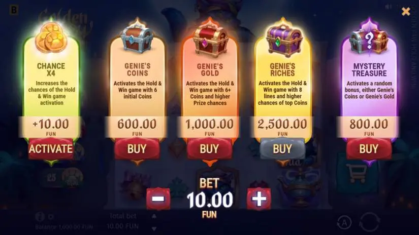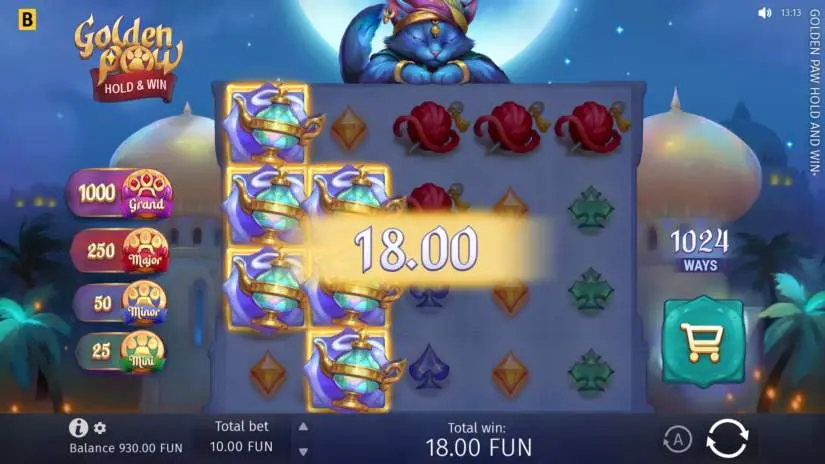 Let the magical sands transport you to an ancient Arabian kingdom in the Golden Paw Hold & Win slot from BGaming, where your wildest dreams will come true. In the majestic halls of an enchanted palace, you’ll be greeted by a genie known as Golden Paw for his unimaginable wealth and generosity. Play his game and claim a share of Golden Paw’s legendary treasure. The reels are filled with the genie’s magic and exciting features, such as the Hold & Win game and prizes with wins up to 1,000x! And to fully immerse yourself in the magic of Golden Paw’s reels, discover 5 bonus features, including the Mysterious Treasure, which will thrill you with an unexpected twist.