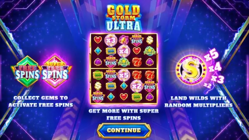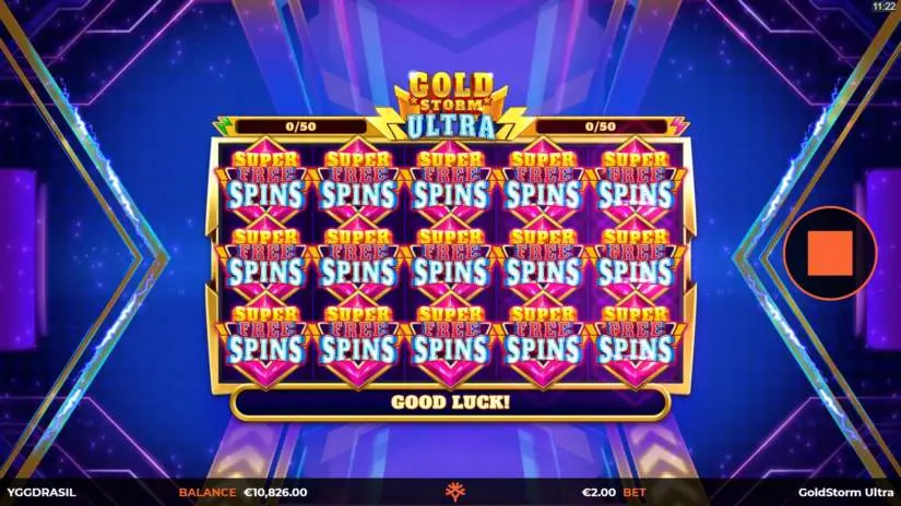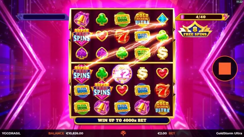 Welcome to the GoldStorm Ultra video slot from Yggdrasil Gaming with Wild symbols, Free Spins and Free Super Spins features. The game has 5 reels, 3 rows and 20 paylines arranged from left to right. The number of paylines can only be changed during Free Super Spins. When two game grids are active, the total number of paylines is 40. The second game grid has the same paylines as the first.
