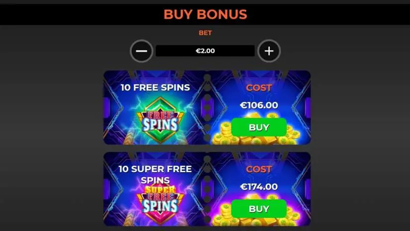 Players can pay x53 to buy standard free spins by setting their desired bet size, or x87 to buy the Super Free Spins mode. In the standard free spins mode, the player gets 10 free spins. In the Super Free Spins mode, the player gets 10 free super spins. RTP of the Buy Bonus option: 94.0%