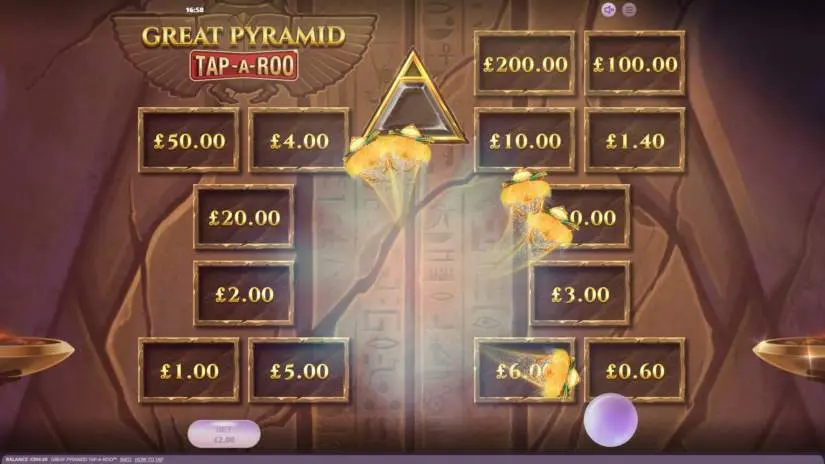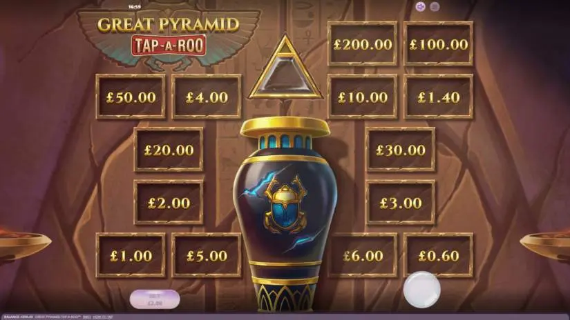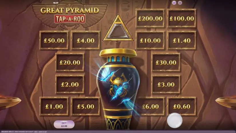 The Great Pyramid Tap-A-Roo game board from Red Tiger Gaming features 14 CASH PRIZES and one Pyramid Bonus sector. CASH PRIZES are multipliers of the current bet. Each bet can cause the vase containing scarabs to break, releasing scarabs that fly to 1-10 random prize sectors to claim a prize. The accumulation of cracks on the vase is purely for visual enjoyment and does not affect when the vase breaks.