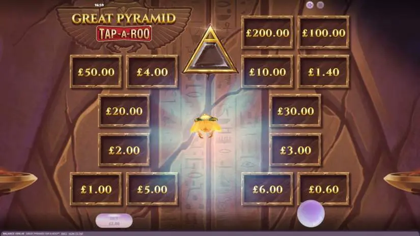 Every bet has a chance of causing magic sand to emerge from the scarab vase and fall into the Pyramid bonus section, filling it to a random level. If the Pyramid bonus section is completely filled, the Plinko Pyramid bonus is activated. The Pyramid bonus section does not progress. Accumulating magic sand there is purely for visual entertainment and does not trigger the bonus round, which is randomly generated.