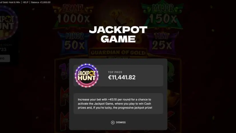 To enable the Double Chance feature in Guardian of Gold Hold & Win, click the “Buy Bonus” button and select “Activate” on the Double Chance card. To disable it, click the “Disable” button on the control panel. Enabling the Double Chance feature doubles your chances of winning in the game by increasing your total bet on each spin. The amount of the total bet increase is always displayed in the Double Chance window. All progress saved during game sessions is retained with the same Double Chance settings.