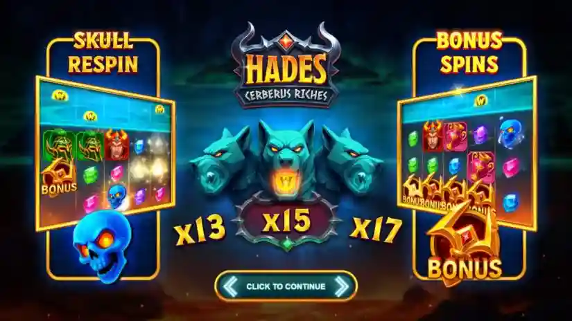 Hades Cerberus Riches is a 3-row, 5-reel Avalanche slot from Fantasma Games featuring Avalanche, Win Both Ways, Wild Cerberus Multiplier, Skull of Charon Feature, Hades Bonus Spins, and Super Bonus Spins with an increasing multiplier.