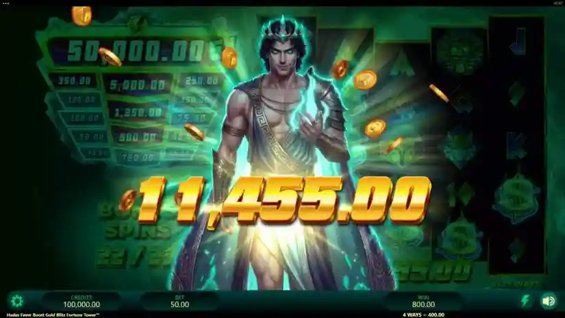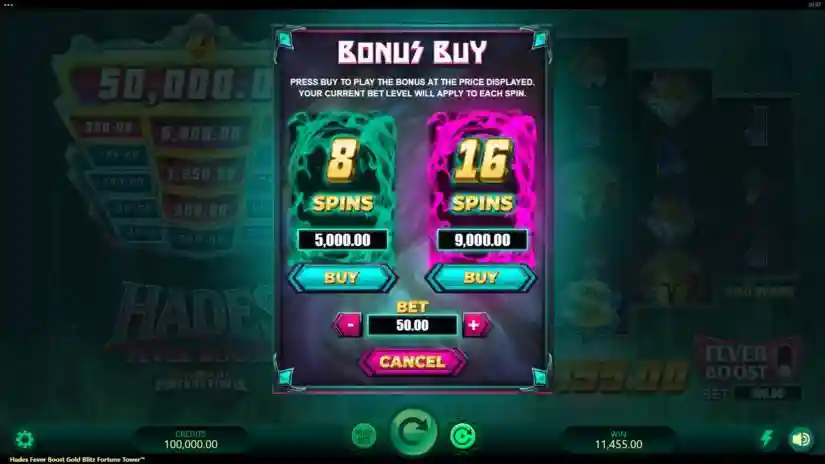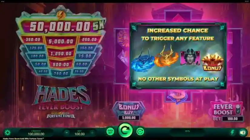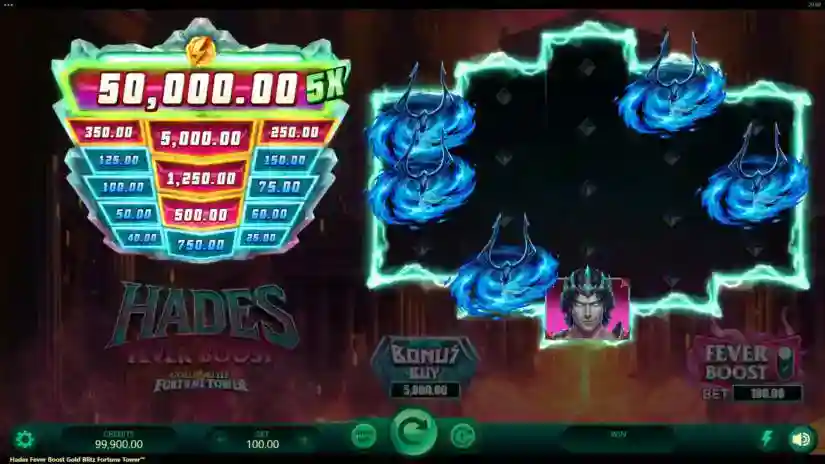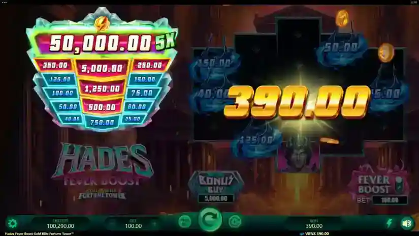 Hades Fever Boost Gold Blitz Fortune Tower is a 5-reel, variable-row video slot from Triple Edge Studios and Fortune Factory Studios. The bonus feature features 5 reels and 5 rows. The goal is to spin the reels until a winning combination appears. Winning combinations are highlighted on the reels and pay out.