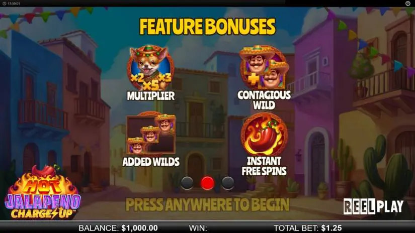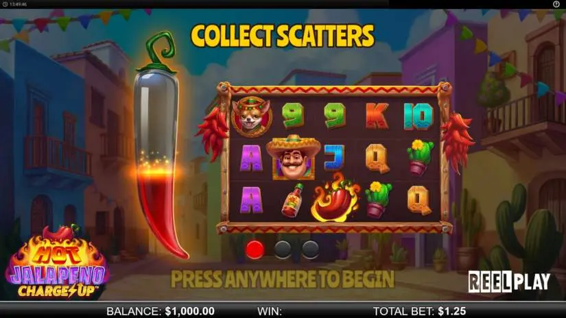 Hot Jalapeno Charge Up™ is an innovative slot from ReelPlay featuring the Charge Up™ mechanic. It features 5 reels, 3 rows, and the following features: