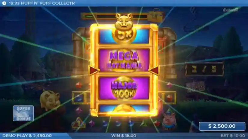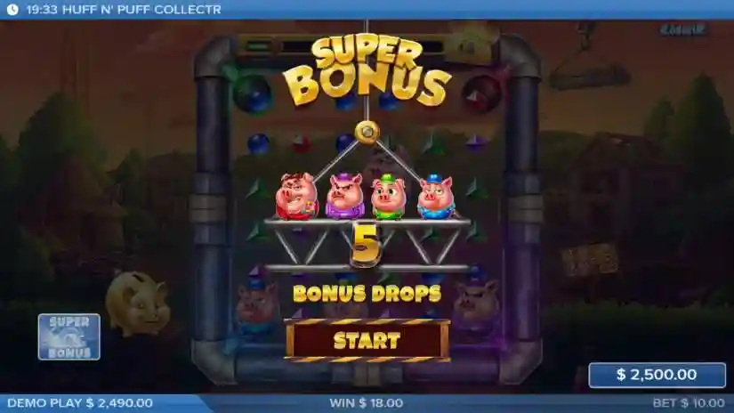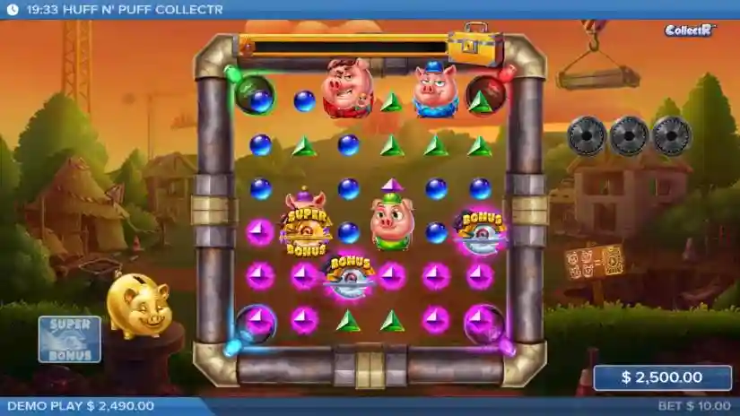 Huff N’ Puff CollectR features nine different types of functional symbols: bonus, super bonus, wild, upgrade, upgrade all, transformation, jackhammer, hat, and wolf construction site.