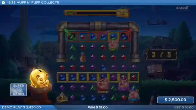 Huff N’ Puff CollectR features four piglet symbols that can move around the game board. Each piglet corresponds to a gem of the same color.